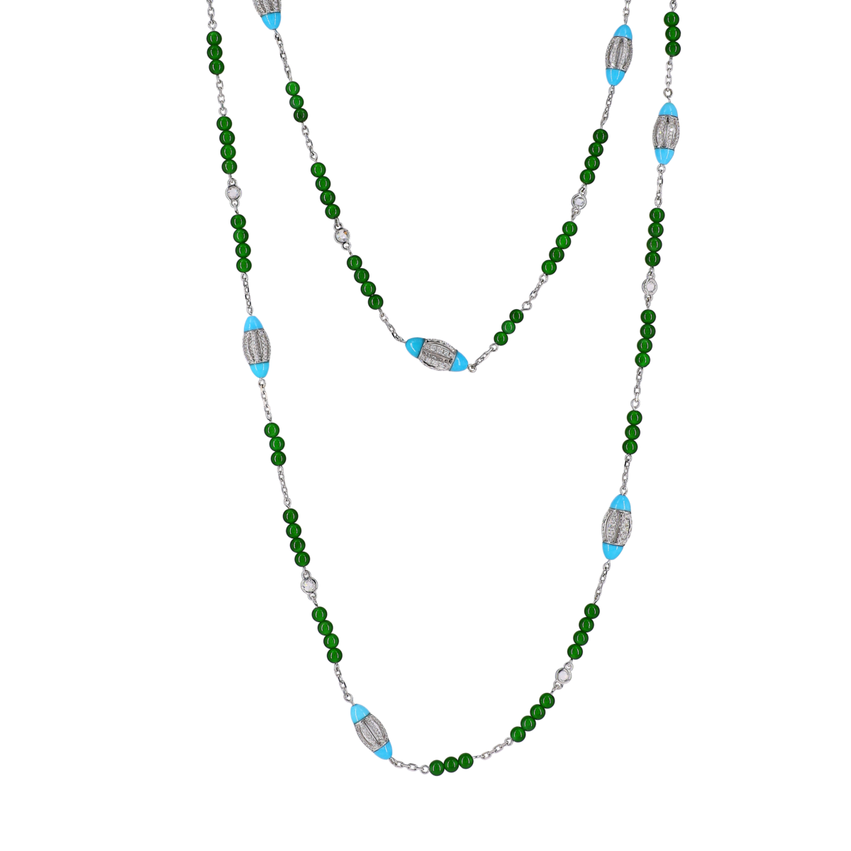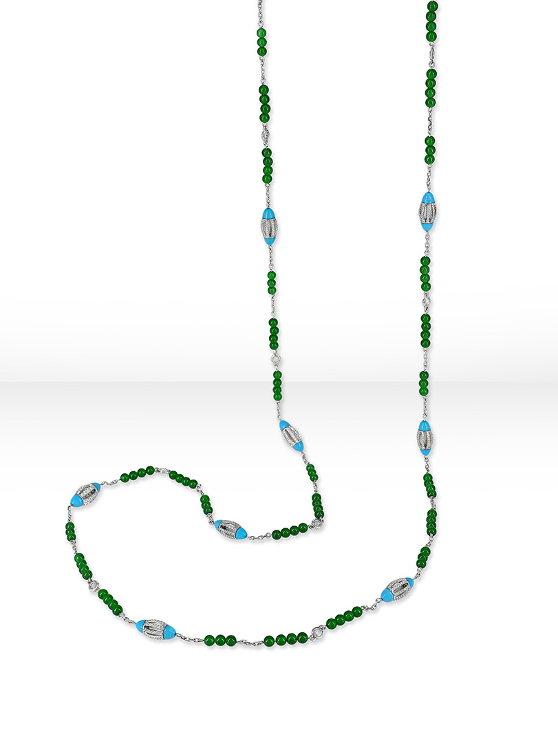 这款长项链结合土耳其石、玉珠和钻石,展现出充满张力的色彩碰撞,鲜明却和谐,为造型注入独特个性。