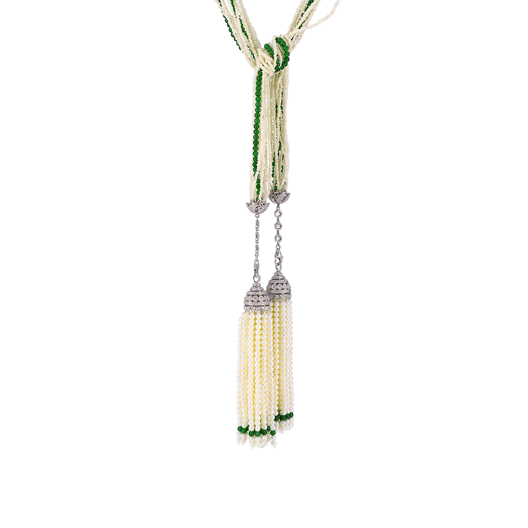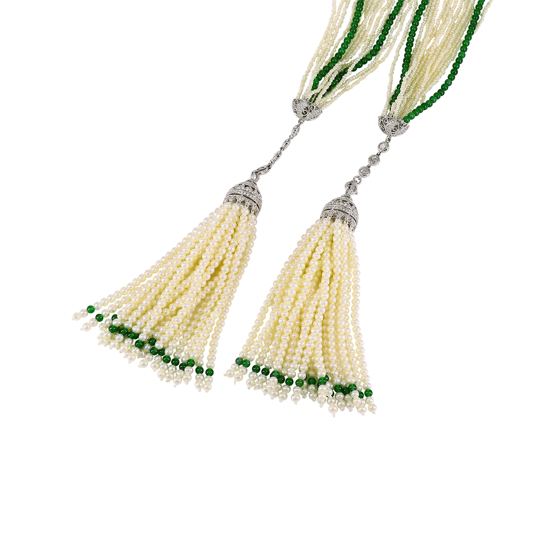 一颗颗的珍珠串成了优雅流苏,搭配翠绿的玉珠与璀璨钻石,仿佛春日晨光中的露珠与绿意,为整体造型增添灵动与层次。在胸前轻轻打个结,随步伐自然摆荡,柔美而不失个性。